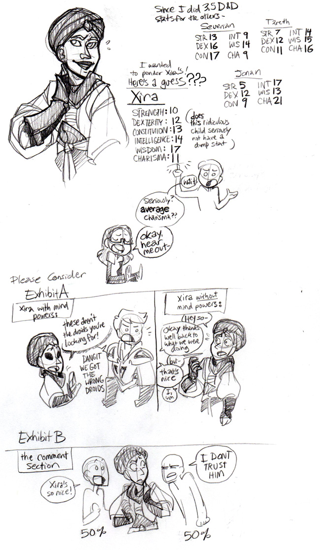 I didn't know what to do for a vote incentive this week so YOU GET SOME THOUGHTS ON XIRA'S D&D STATS, except I'm still back in 3.5 land and you'll just have to bear with me. xD Click the blue box for the extra doodle!