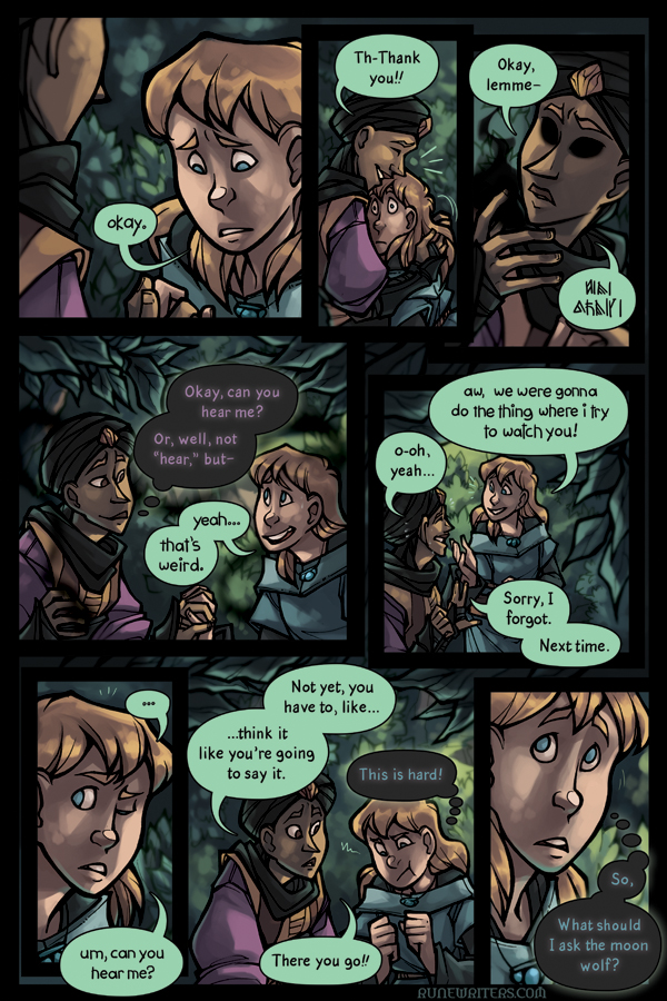 After this update, the update schedule for Runewriters is changing in a kind of big way -- I'm gonna try moving to "scene" updates! This means that instead of getting out one page a week, I wait until I've finished 4-5 pages and post them all at once as one "scene."