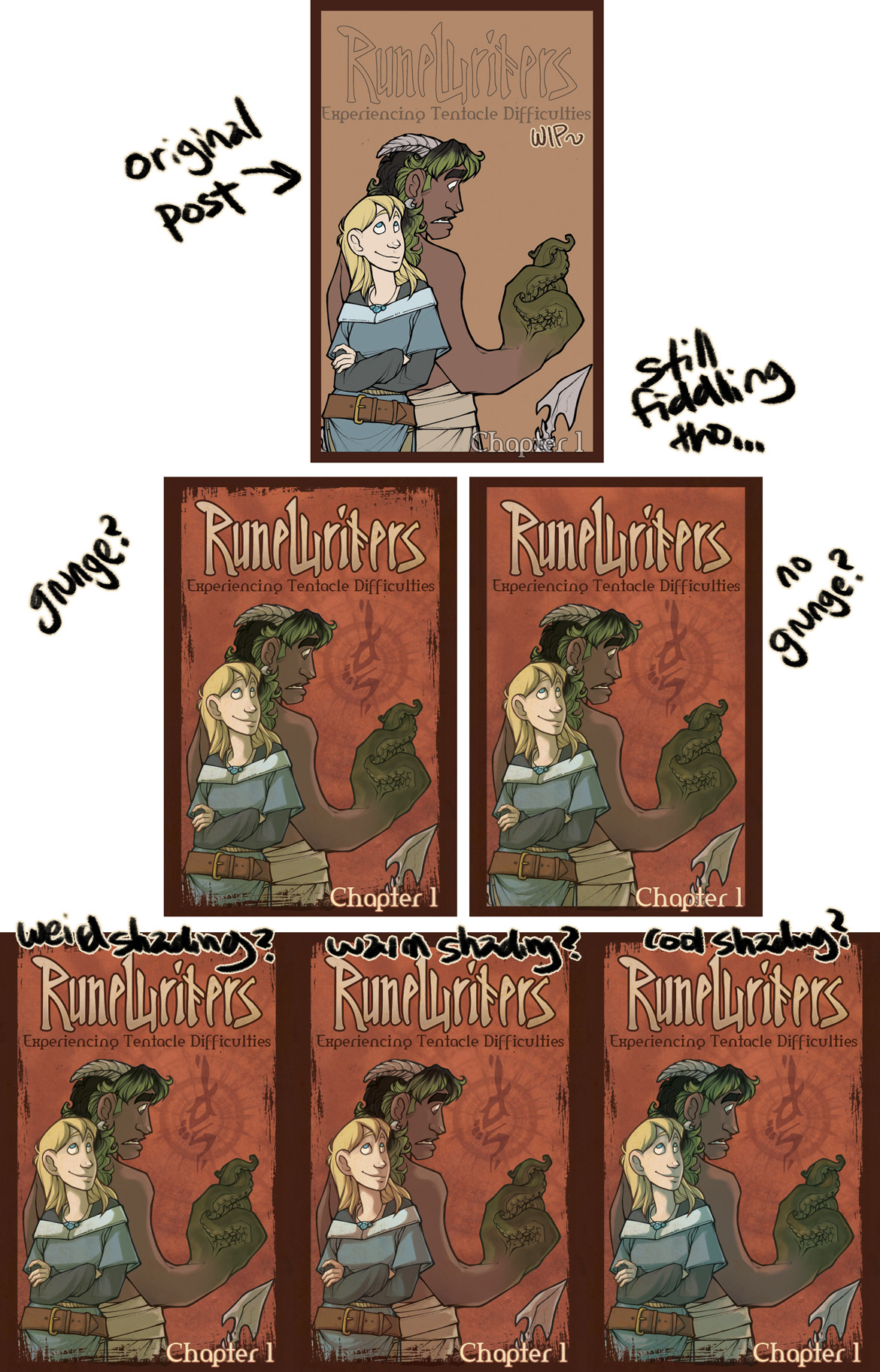 TNH know, the last page was, um, unexpectedly epic! @u@ And took up most of my Runewritering time. But I have been working on a cover for printed copies of Chapter 1 (which I am hoping to have at conventions this summer!) so I thought I would let you have a peak at it! Right now I am just fiddling with sticking colours on it.